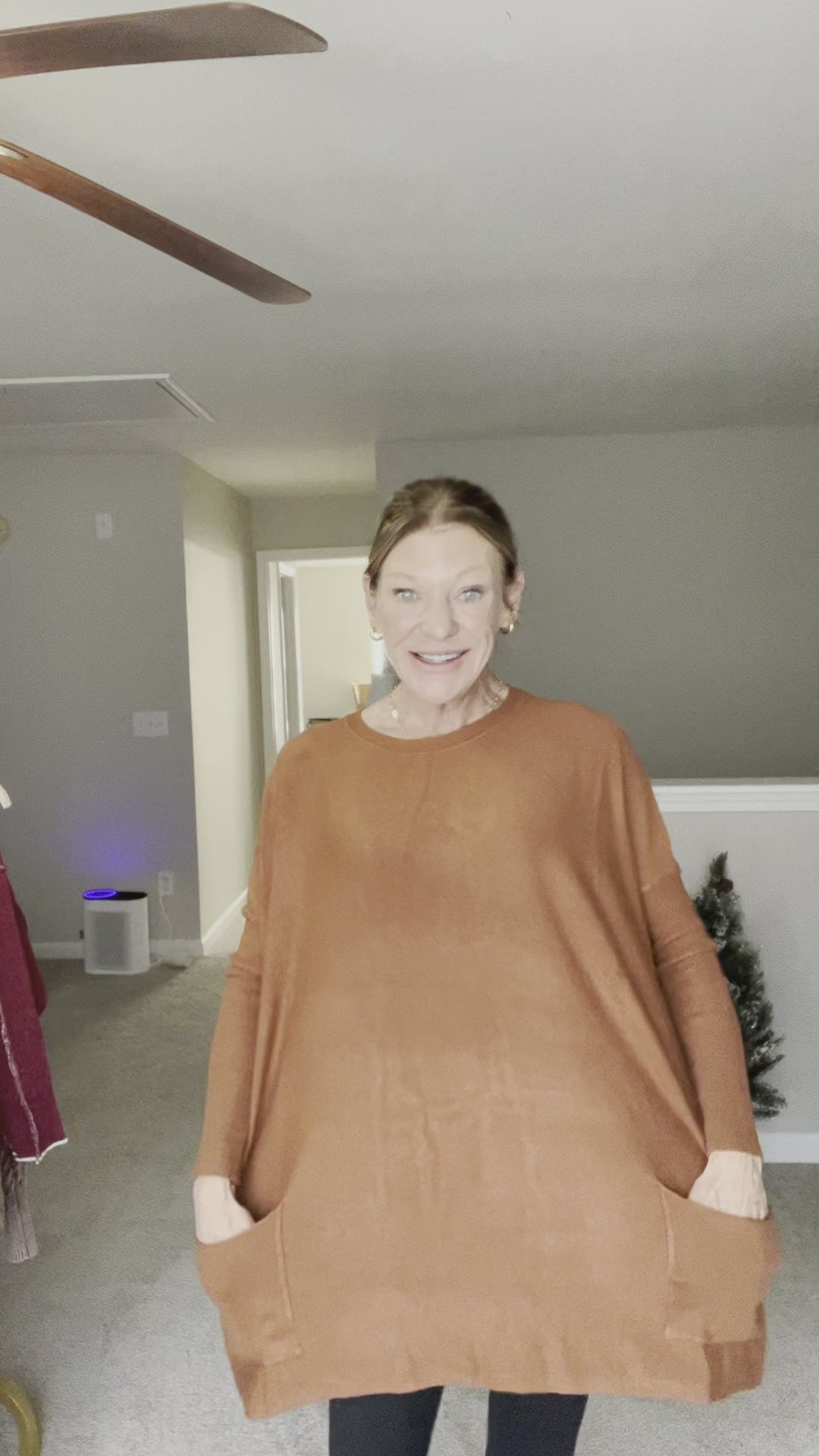 Adorable soft oversized pocket sweater is loose through the body and fitted sleeves. It has a tunic fit and flowy body! Available in 2 colors Fits true to size and is available in Small/Medium & Mediun/Large. Perfect paired with leggings!